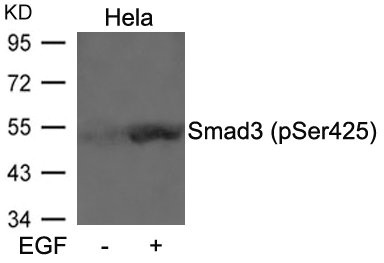 Western blot analysis of extracts from Hela cells untreated or treated with EGF using Smad3(Phospho-Ser425) Antibody.