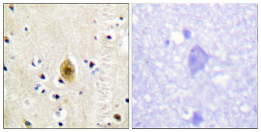 Immunohistochemistry analysis of paraffin-embedded human brain tissue, using Mst1/2 (Phospho-Thr183) antibody. The picture on the right is treated with the synthesized peptide.