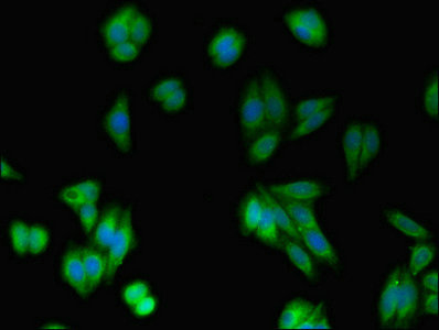 Immunofluorescent analysis of HepG2 cells using CSB-PA019152LA01HU at dilution of 1:100 and Alexa Fluor 488-congugated AffiniPure Goat Anti-Rabbit IgG(H+L)