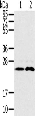 Gel: 10%SDS-PAGE, Lysate: 40 μg, Lane 1-2: Mouse brain tissue, Raji cells, Primary antibody: CSB-PA793696(RAB14 Antibody) at dilution 1/200, Secondary antibody: Goat anti rabbit IgG at 1/8000 dilution, Exposure time: 30 seconds