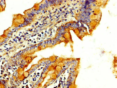 IHC image of CSB-PA872480LA01HU diluted at 1:300 and staining in paraffin-embedded human small intestine tissue performed on a Leica BondTM system. After dewaxing and hydration, antigen retrieval was mediated by high pressure in a citrate buffer (pH 6.0). Section was blocked with 10% normal goat serum 30min at RT. Then primary antibody (1% BSA) was incubated at 4°C overnight. The primary is detected by a biotinylated secondary antibody and visualized using an HRP conjugated SP system.