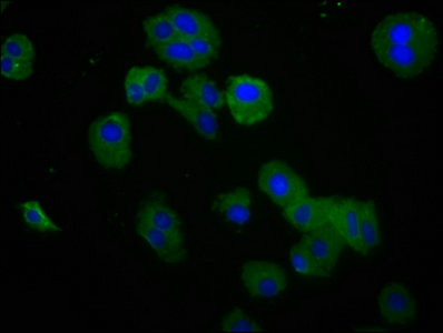 Immunofluorescence staining of HepG2 cells with CSB-PA855052LA01HU at 1:200, counter-stained with DAPI. The cells were fixed in 4% formaldehyde, permeabilized tissue using 0.2% Triton X-100 and blocked in 10% normal Goat Serum. The cells were then incubated with the antibody overnight at 4°C.The secondary antibody was Alexa Fluor 488-congugated AffiniPure Goat Anti-Rabbit IgG (H+L).