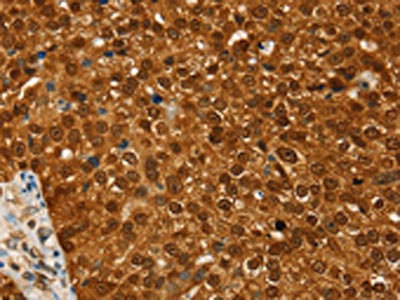 The image on the left is immunohistochemistry of paraffin-embedded Human ovarian cancer tissue using CSB-PA122817(RAN Antibody) at dilution 1/20, on the right is treated with fusion protein. (Original magnification: ×200)