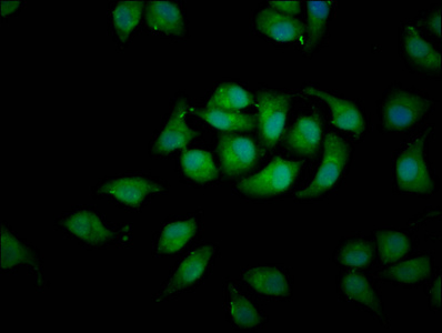 Immunofluorescence staining of A549 cells with CSB-PA801247LA01HU at 1:100, counter-stained with DAPI. The cells were fixed in 4% formaldehyde, permeabilized using 0.2% Triton X-100 and blocked in 10% normal Goat Serum. The cells were then incubated with the antibody overnight at 4°C. The secondary antibody was Alexa Fluor 488-congugated AffiniPure Goat Anti-Rabbit IgG(H+L).
