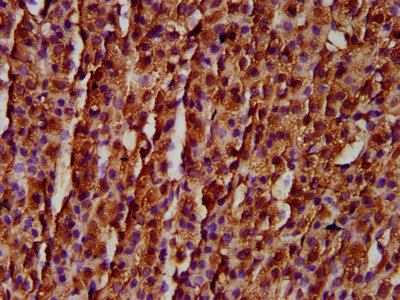 IHC image of CSB-PA801247LA01HU diluted at 1:300 and staining in paraffin-embedded human adrenal gland tissue performed on a Leica BondTM system. After dewaxing and hydration, antigen retrieval was mediated by high pressure in a citrate buffer (pH 6.0). Section was blocked with 10% normal goat serum 30min at RT. Then primary antibody (1% BSA) was incubated at 4°C overnight. The primary is detected by a biotinylated secondary antibody and visualized using an HRP conjugated SP system.