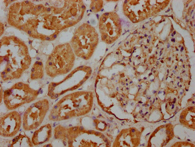 IHC image of CSB-PA754570ESR2HU diluted at 1:263 and staining in paraffin-embedded human kidney tissue performed on a Leica BondTM system. After dewaxing and hydration, antigen retrieval was mediated by high pressure in a citrate buffer (pH 6.0). Section was blocked with 10% normal goat serum 30min at RT. Then primary antibody (1% BSA) was incubated at 4°C overnight. The primary is detected by a biotinylated secondary antibody and visualized using an HRP conjugated SP system.