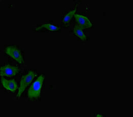Immunofluorescent analysis of Hela cells using CSB-PA019486LA01HU at dilution of 1:100 and Alexa Fluor 488-congugated AffiniPure Goat Anti-Rabbit IgG(H+L)