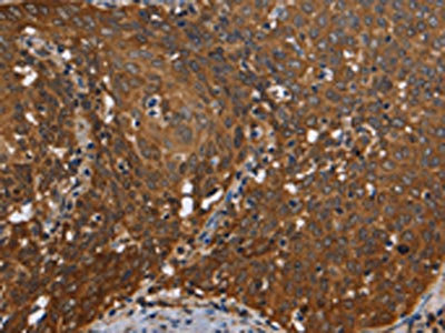 The image on the left is immunohistochemistry of paraffin-embedded Human cervical cancer tissue using CSB-PA038229(REL Antibody) at dilution 1/50, on the right is treated with fusion protein. (Original magnification: ×200)
