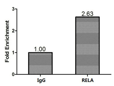 Chromatin Immunoprecipitation Hela (1.2*106) were cross-linked with formaldehyde, sonicated, and immunoprecipitated with 4µg anti-RELA or a control normal rabbit IgG. The resulting ChIP DNA was quantified using real-time PCR with primers (CSB-PP03987HU) against the IkBα promoter.