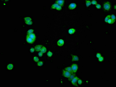 Immunofluorescence staining of PC-3 cells with CSB-PA03987A0Rb at 1:200, counter-stained with DAPI. The cells were fixed in 4% formaldehyde, permeabilized using 0.2% Triton X-100 and blocked in 10% normal Goat Serum. The cells were then incubated with the antibody overnight at 4°C. The secondary antibody was Alexa Fluor 488-congugated AffiniPure Goat Anti-Rabbit IgG(H+L).
