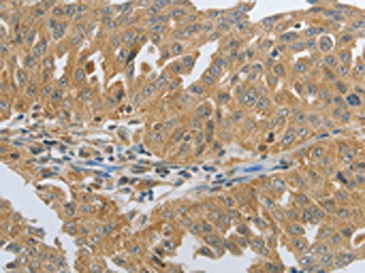 The image on the left is immunohistochemistry of paraffin-embedded Human ovarian cancer tissue using CSB-PA442874(RHEB Antibody) at dilution 1/25, on the right is treated with synthetic peptide. (Original magnification: ×200)