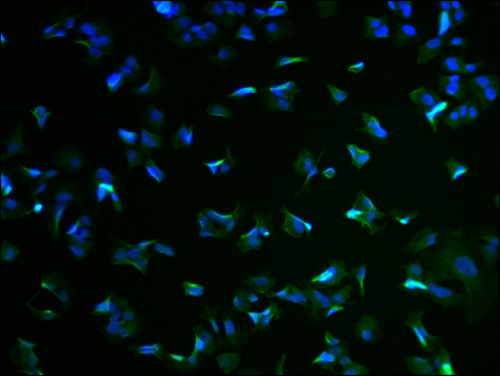 Immunofluorescence staining of MCF-7 cells with CSB-PA862012LA01HU at 1:100, counter-stained with DAPI. The cells were fixed in 4% formaldehyde and blocked in 10% normal Goat Serum. The cells were then incubated with the antibody overnight at 4°C. The secondary antibody was Alexa Fluor 488-congugated AffiniPure Goat Anti-Rabbit IgG(H+L).