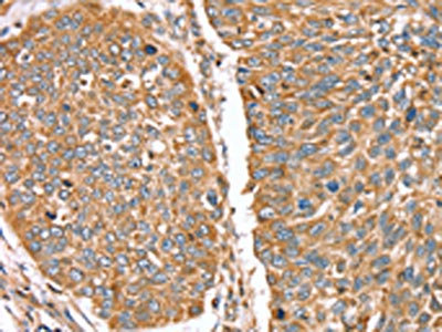 The image on the left is immunohistochemistry of paraffin-embedded Human lung cancer tissue using CSB-PA134767(RNF11 Antibody) at dilution 1/40, on the right is treated with fusion protein. (Original magnification: ×200)