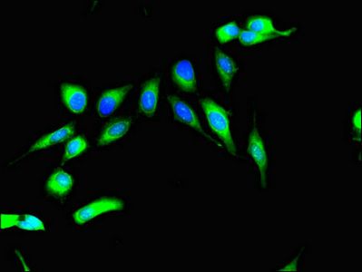Immunofluorescent analysis of Hela cells using CSB-PA020467LA01HU at dilution of 1:100 and Alexa Fluor 488-congugated AffiniPure Goat Anti-Rabbit IgG(H+L)