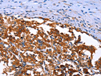 The image on the left is immunohistochemistry of paraffin-embedded Human thyroid cancer tissue using CSB-PA077840(RPS6KA6 Antibody) at dilution 1/20, on the right is treated with synthetic peptide. (Original magnification: ×200)