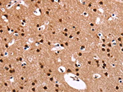 The image on the left is immunohistochemistry of paraffin-embedded Human brain tissue using CSB-PA937841(RPSA Antibody) at dilution 1/60, on the right is treated with fusion protein. (Original magnification: ×200)