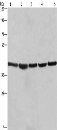 Gel: 10%SDS-PAGE, Lysate: 40 μg, Lane 1-5: A549 cells, NIH/3T3 cells, 293T cells, human hepatocellular carcinoma tissue, hela cells, Primary antibody: CSB-PA937841(RPSA Antibody) at dilution 1/433.3, Secondary antibody: Goat anti rabbit IgG at 1/8000 dilution, Exposure time: 15 seconds