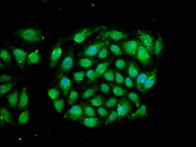 Immunofluorescence staining of A549 cells with CSB-PA03465A0Rb at 1:66, counter-stained with DAPI. The cells were fixed in 4% formaldehyde, permeabilized using 0.2% Triton X-100 and blocked in 10% normal Goat Serum. The cells were then incubated with the antibody overnight at 4°C. The secondary antibody was Alexa Fluor 488-congugated AffiniPure Goat Anti-Rabbit IgG(H+L).