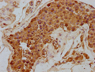 IHC image of CSB-PA856415LA01HU diluted at 1:300 and staining in paraffin-embedded human testis tissue performed on a Leica BondTM system. After dewaxing and hydration, antigen retrieval was mediated by high pressure in a citrate buffer (pH 6.0). Section was blocked with 10% normal goat serum 30min at RT. Then primary antibody (1% BSA) was incubated at 4°C overnight. The primary is detected by a biotinylated secondary antibody and visualized using an HRP conjugated SP system.
