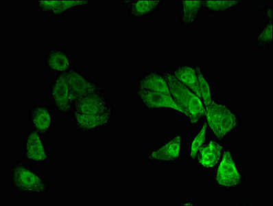 Immunofluorescent analysis of HepG2 cells using CSB-PA020592LA01HU at dilution of 1:100 and Alexa Fluor 488-congugated AffiniPure Goat Anti-Rabbit IgG(H+L)