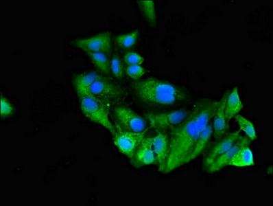 Immunofluorescent analysis of Hela cells using CSB-PA020595LA01HU at dilution of 1:100 and Alexa Fluor 488-congugated AffiniPure Goat Anti-Rabbit IgG(H+L)