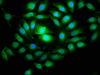 Immunofluorescence staining of A549 cells with CSB-PA896483LA01HU at 1:266, counter-stained with DAPI. The cells were fixed in 4% formaldehyde, permeabilized using 0.2% Triton X-100 and blocked in 10% normal Goat Serum. The cells were then incubated with the antibody overnight at 4°C. The secondary antibody was Alexa Fluor 488-congugated AffiniPure Goat Anti-Rabbit IgG(H+L).