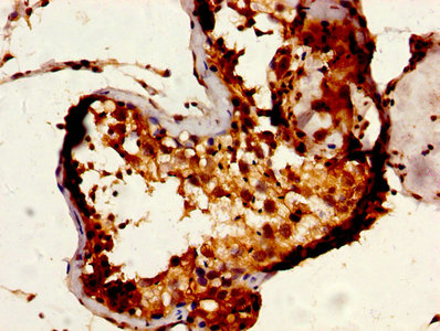IHC image of CSB-PA896483LA01HU diluted at 1:600 and staining in paraffin-embedded human testis tissue performed on a Leica BondTM system. After dewaxing and hydration, antigen retrieval was mediated by high pressure in a citrate buffer (pH 6.0). Section was blocked with 10% normal goat serum 30min at RT. Then primary antibody (1% BSA) was incubated at 4°C overnight. The primary is detected by a biotinylated secondary antibody and visualized using an HRP conjugated SP system.