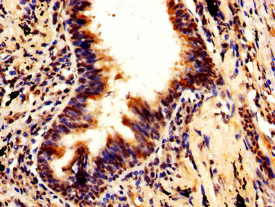 IHC image of CSB-PA896483LA01HU diluted at 1:600 and staining in paraffin-embedded human lung cancer performed on a Leica BondTM system. After dewaxing and hydration, antigen retrieval was mediated by high pressure in a citrate buffer (pH 6.0). Section was blocked with 10% normal goat serum 30min at RT. Then primary antibody (1% BSA) was incubated at 4°C overnight. The primary is detected by a biotinylated secondary antibody and visualized using an HRP conjugated SP system.