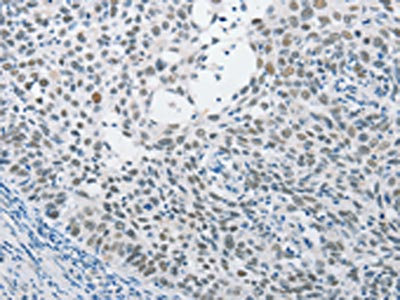 The image on the left is immunohistochemistry of paraffin-embedded Human cervical cancer tissue using CSB-PA897667(SAE1 Antibody) at dilution 1/15, on the right is treated with fusion protein. (Original magnification: ×200)