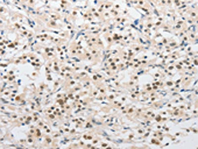 The image on the left is immunohistochemistry of paraffin-embedded Human thyroid cancer tissue using CSB-PA897667(SAE1 Antibody) at dilution 1/15, on the right is treated with fusion protein. (Original magnification: ×200)