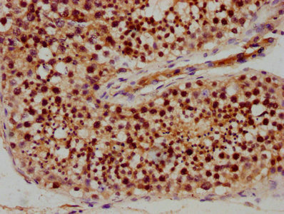 IHC image of CSB-PA020670LA01HU diluted at 1:400 and staining in paraffin-embedded human testis tissue performed on a Leica BondTM system. After dewaxing and hydration, antigen retrieval was mediated by high pressure in a citrate buffer (pH 6.0). Section was blocked with 10% normal goat serum 30min at RT. Then primary antibody (1% BSA) was incubated at 4°C overnight. The primary is detected by a biotinylated secondary antibody and visualized using an HRP conjugated SP system.