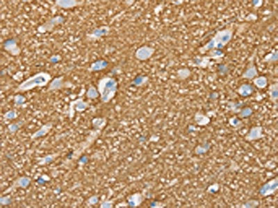 The image on the left is immunohistochemistry of paraffin-embedded Human brain tissue using CSB-PA256001(SCD Antibody) at dilution 1/25, on the right is treated with synthetic peptide. (Original magnification: ×200)