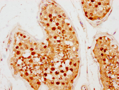 IHC image of CSB-PA891470LA01HU diluted at 1:500 and staining in paraffin-embedded human testis tissue performed on a Leica BondTM system. After dewaxing and hydration, antigen retrieval was mediated by high pressure in a citrate buffer (pH 6.0). Section was blocked with 10% normal goat serum 30min at RT. Then primary antibody (1% BSA) was incubated at 4°C overnight. The primary is detected by a biotinylated secondary antibody and visualized using an HRP conjugated SP system.