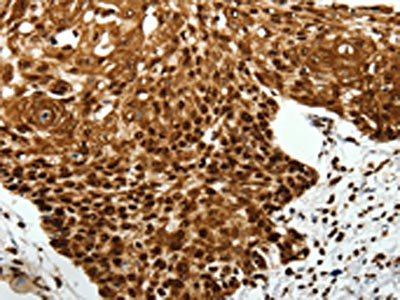 The image on the left is immunohistochemistry of paraffin-embedded Human cervical cancer tissue using CSB-PA409848(SCN1A Antibody) at dilution 1/40, on the right is treated with synthetic peptide. (Original magnification: ×200)