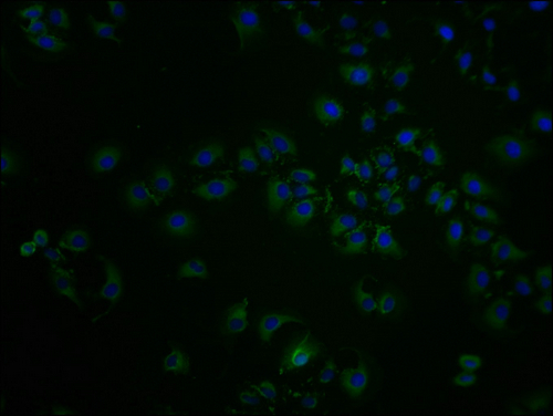 Immunofluorescence staining of A549 cells with CSB-PA020850LA01HU at 1:100, counter-stained with DAPI. The cells were fixed in 4% formaldehyde and blocked in 10% normal Goat Serum. The cells were then incubated with the antibody overnight at 4°C. The secondary antibody was Alexa Fluor 488-congugated AffiniPure Goat Anti-Rabbit IgG(H+L).