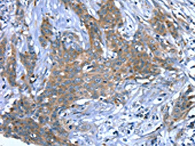 The image on the left is immunohistochemistry of paraffin-embedded Human cervical cancer tissue using CSB-PA115388(SCPEP1 Antibody) at dilution 1/30, on the right is treated with fusion protein. (Original magnification: ×200)