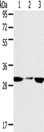 Gel: 8%SDS-PAGE, Lysate: 40 μg, Lane 1-3: PC3 cells, hepg2 cells, human fetal liver tissue, Primary antibody: CSB-PA192307(SDHB Antibody) at dilution 1/400, Secondary antibody: Goat anti rabbit IgG at 1/8000 dilution, Exposure time: 30 seconds