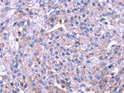 The image on the left is immunohistochemistry of paraffin-embedded Human liver cancer tissue using CSB-PA692718(SENP2 Antibody) at dilution 1/20, on the right is treated with fusion protein. (Original magnification: ×200)