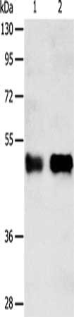 Gel: 10%SDS-PAGE, Lysate: 40 μg, Lane 1-2: Human liver cancer tissue, A549 cells, Primary antibody: CSB-PA729954(SERPINA5 Antibody) at dilution 1/750, Secondary antibody: Goat anti rabbit IgG at 1/8000 dilution, Exposure time: 10 minutes