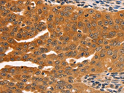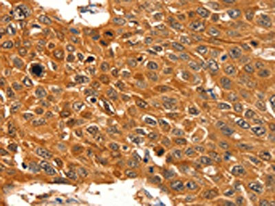 The image on the left is immunohistochemistry of paraffin-embedded Human ovarian cancer tissue using CSB-PA080360(SERPINB5 Antibody) at dilution 1/60, on the right is treated with fusion protein. (Original magnification: ×200)