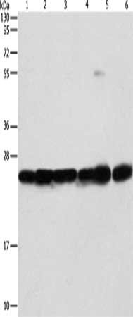 Gel: 10%SDS-PAGE, Lysate: 40 μg, Lane 1-6: Mouse liver tissue, Mouse brain tissue, 293T cells, A549 cells, A431 cells, PC3 cells, Primary antibody: CSB-PA209031(SIGMAR1 Antibody) at dilution 1/310, Secondary antibody: Goat anti rabbit IgG at 1/8000 dilution, Exposure time: 1 second