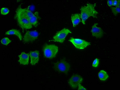 Immunofluorescence staining of MCF-7 cells with CSB-PA732939LA01HU at 1:133, counter-stained with DAPI. The cells were fixed in 4% formaldehyde, permeabilized using 0.2% Triton X-100 and blocked in 10% normal Goat Serum. The cells were then incubated with the antibody overnight at 4°C. The secondary antibody was Alexa Fluor 488-congugated AffiniPure Goat Anti-Rabbit IgG(H+L).