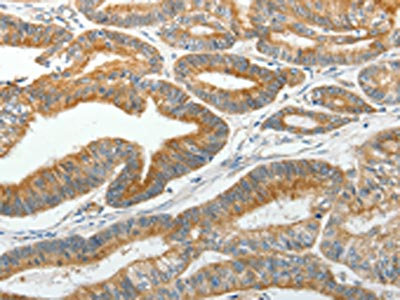 The image on the left is immunohistochemistry of paraffin-embedded Human colon cancer tissue using CSB-PA572733(SLC12A4 Antibody) at dilution 1/30, on the right is treated with fusion protein. (Original magnification: ×200)