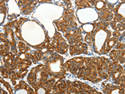 The image on the left is immunohistochemistry of paraffin-embedded Human thyroid cancer tissue using CSB-PA572733(SLC12A4 Antibody) at dilution 1/30, on the right is treated with fusion protein. (Original magnification: ×200)