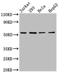 Positive WB detected in: Jurkat whole cell lysate, 293 whole cell lysate, Hela whole cell lysate, HepG2 whole cell lysate