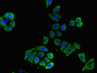 Immunofluorescent analysis of PC-3 cells using CSB-PA742402LA01HU at dilution of 1:100 and Alexa Fluor 488-congugated AffiniPure Goat Anti-Rabbit IgG(H+L)