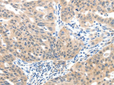 The image on the left is immunohistochemistry of paraffin-embedded Human ovarian cancer tissue using CSB-PA132606(SLC20A1 Antibody) at dilution 1/40, on the right is treated with synthetic peptide. (Original magnification: ×200)