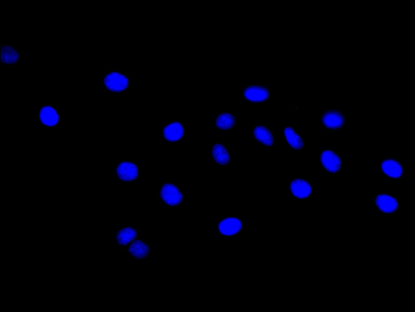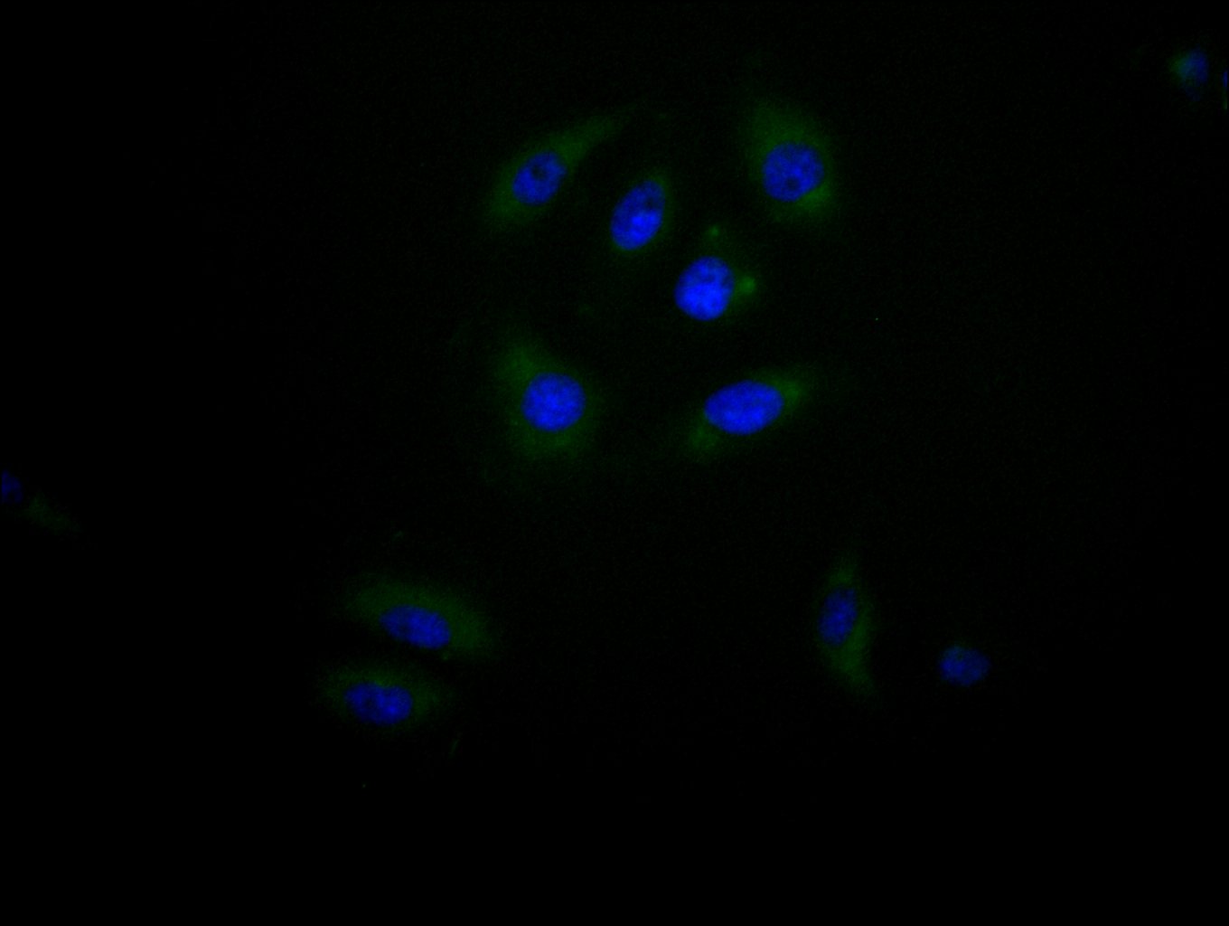 Immunofluorescence staining of A549 cell with CSB-PA823881LA01HU at 1:100, counter-stained with DAPI. The cells were fixed in 4% formaldehyde and blocked in 10% normal Goat Serum. The cells were then incubated with the antibody overnight at 4C. The secondary antibody was Alexa Fluor 488-congugated AffiniPure Goat Anti-Rabbit IgG(H+L).