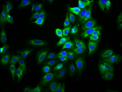 Immunofluorescence staining of HepG2 cells with CSB-PA741974LA01HU at 1:66, counter-stained with DAPI. The cells were fixed in 4% formaldehyde, permeabilized using 0.2% Triton X-100 and blocked in 10% normal Goat Serum. The cells were then incubated with the antibody overnight at 4°C.The secondary antibody was Alexa Fluor 488-congugated AffiniPure Goat Anti-Rabbit IgG(H+L).