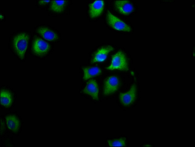 Immunofluorescence staining of A549 cells with CSB-PA740768LA01HU at 1:100, counter-stained with DAPI. The cells were fixed in 4% formaldehyde, permeabilized using 0.2% Triton X-100 and blocked in 10% normal Goat Serum. The cells were then incubated with the antibody overnight at 4°C. The secondary antibody was Alexa Fluor 488-congugated AffiniPure Goat Anti-Rabbit IgG(H+L).